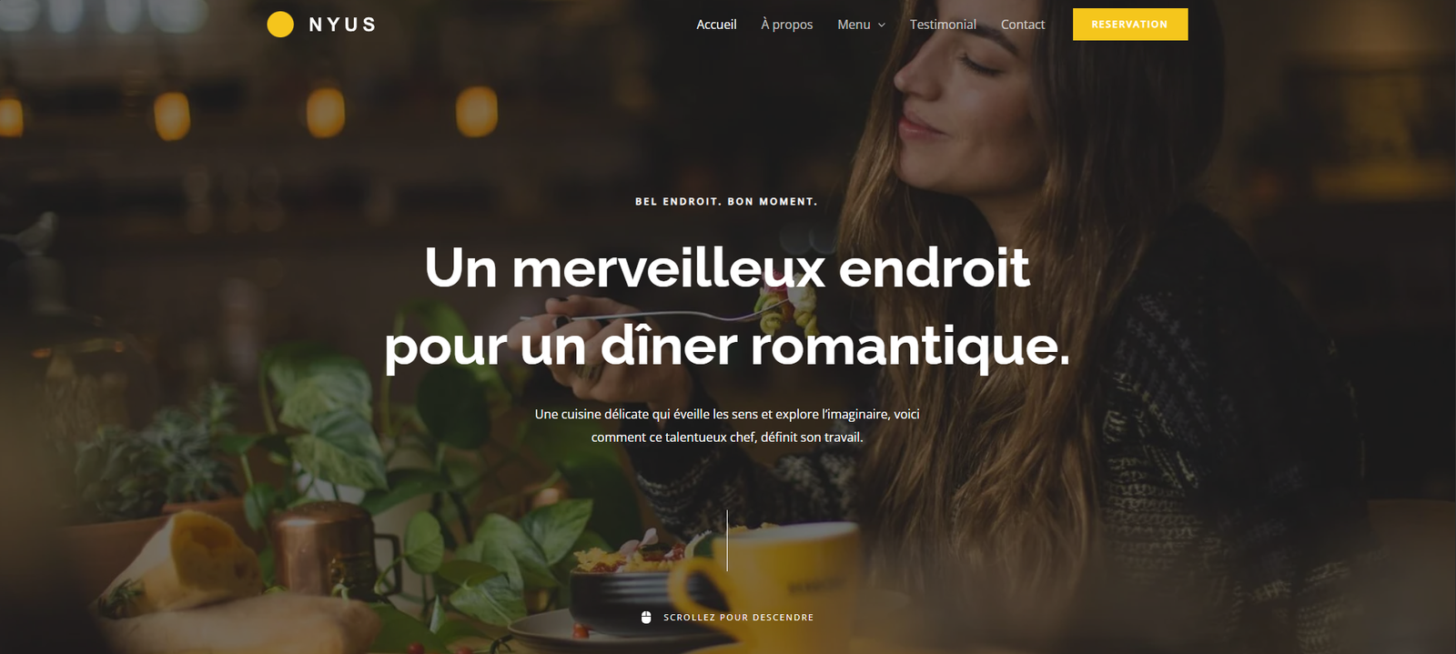 Modèle dynamique et élégant pour restaurants ou bars : design épuré, photos engageantes, navigation fluide et contenu mis en valeur.