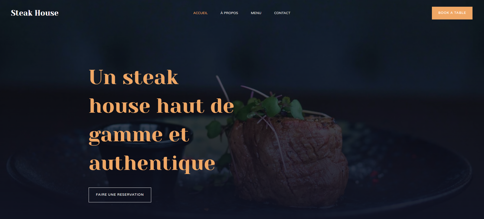 Un site élégant de restaurant steakhouse : photos appétissantes, menu clair, ambiance raffinée, navigation intuitive, réservation facile.